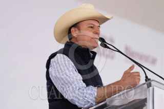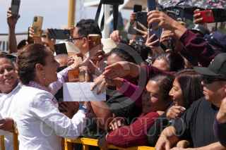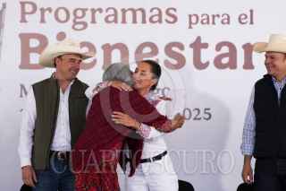 MAPIMI, DURANGO, 23FEBRERO2025.- Claudia Sheinbaum, Presidenta de México, encabezó la presentación de Programas para el Bienestar en el norte de país. La acompañaron; Eduardo Tricio, empresario; Ariana Montiel, secretaria de Bienestar; Manolo Jiménez Salinas, gobernador de Coahuila; Esteban Villegas Villareal, gobernador de Durango, y Citlalli Hernández, secretaria de la Mujeres. FOTO: PRESIDENCIA/CUARTOSCURO.COM