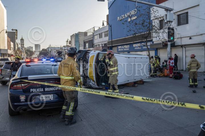 TIJUANA BAJA CALIFORNIA 23FEBRERO2025.- Los vehículos involucrados son un taxi de ruta blanco con amarillo y un auto Honda, Accord con placas de California el cual presuntamente fue el responsable del accidente, por lo que el conductor fue detenido por autoridades. Bomberos y paramédicos de la Cruz Roja arribaron al lugar para atender a los pasajeros que viajaban en el taxi, entre ellos personas de la tercera edad; tres pasajeros fueron trasladados a un hospital. Abel Ojeda, supervisor de bomberos, comentó que fueron aproximadamente 8 elementos de bomberos de una estación los que estuvieron trabajando en el lugar. Según información extraoficial fue el conductor del taxi blanco con amarillo el que resultara sin vida tras terminar aplastado por el mismo taxi. Los hechos se registraron alrededor de las 7:23 de la mañana, sobre la calle 2da y avenida Mutualismo, lugar que permanecio cerrado debido a las maniobras de los cuerpos de emergencias. FOTO: OMAR MARTÍNEZ/ CUARTOSCURO.COM