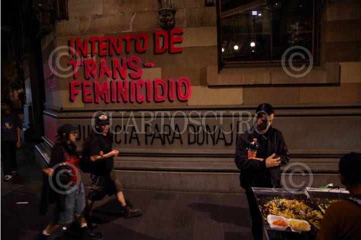 CIUDAD DE MÉXICO, 23FEBRERO2025.- Colectivas de mujeres que trabajan en comercio ambulante en las inmediaciones de la Alameda Central protestas deteniendo el tráfico de eje central para que se resuelva e investigue el supuesto intento de feminicidio esta tarde al querer impedir que trabajara Dana una mujer trans por parte de personal de la policía. FOTO: ANDREA MURCIA /CUARTOSCURO.COM