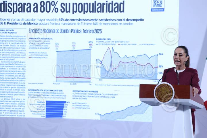 CIUDAD DE MÉXICO, 24FEBRERO2025.- Claudia Sheinbaum, Presidenta de México, muestra una encuesta de El Universal en la que destaca su alza de popularidad por su postura ante los dichos del Presidente de Estados Unidos, Donald Trump, durare la mañanera del pueblo. FOTO: MOISÉS PABLO/CUARTOSCURO.COM