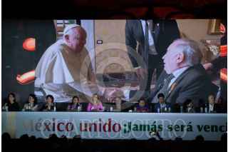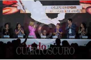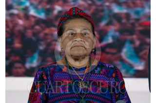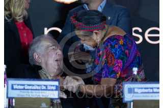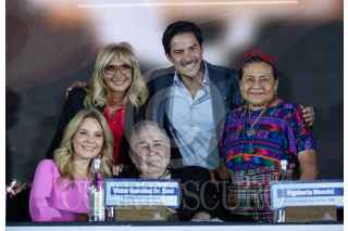 CIUDAD DE MÉXICO, 24FEBRERO2025.- Rigoberta Menchú, premio Nobel de la Paz 1992; Víctor González Herrera, presidente ejecutivo grupo por un país mejor acompañaron a Víctor González “Dr. Simi, presidente fundador grupo por un país mejor durante su destape como posible nominado del Premio Nobel de la Paz que se llevó a cabo en Polyforum Siqueiros. FOTO: ANDREA MURCIA /CUARTOSCURO.COM