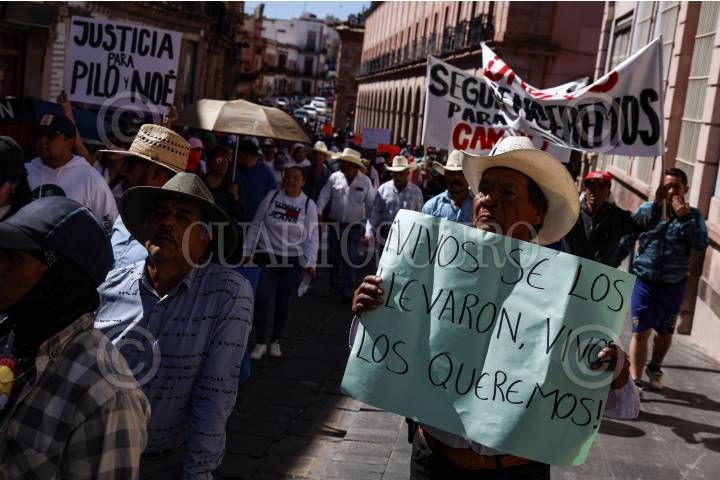 ZACATECAS, ZACATECAS, 25FEBRERO2025.- Cientos de personas de diferentes comunidades agrarias del municipio de Morelos y organizaciones campesinas marcharon sobre el bulevar metropolitano para después entrar al centro de la ciudad y llegar a Plaza de Armas para demandar la aparición con vida de Noe Alonso Martínez Cervantes y José Porfirio Uriel Trejo Acosta, productores de frijol, desaparecidos el pasado 20 de febrero en el municipio de Guadalupe. Previo al inicio de la marcha se tuvo conocimiento de su aparición con vida, pero familiares y organizadores decidieron continuar con la marcha ya que se encontraban otros familiares de personas desaparecidas. FOTO: ADOLFO VLADIMIR /CUARTOSCURO.COM