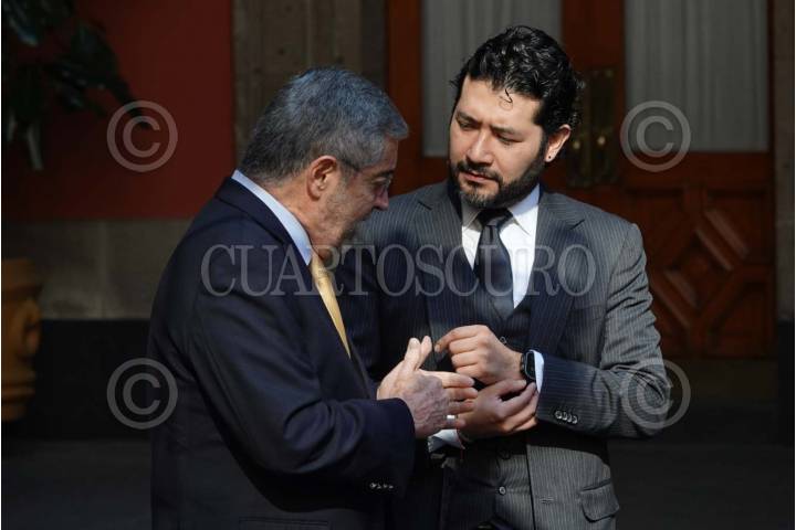 CIUDAD DE MÉXICO, 26FEBRERO2025.- Juan Ramón de la Fuente, secretario de Relaciones Exteriores, y Marath Bolaños Bolaños, secretario del Trabajo y Previsión Social, durante el 112 Aniversario de Francisco I Madero realizado en el Patio de Honor en Palacio Nacional. FOTO: GRACIELA LÓPEZ/CUARTOSCURO.COM