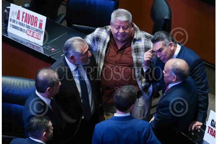 CIUDAD DE MÉXICO, 26FEBRERO2025.- Miguel Riquelme, senador priísta; Adán Augusto López, coordinador de Morena, Héctor Ladrón de Guevara; Alejandro Moreno Cárdenas, senador priísta; Manuel Añorve Baños, coordinador priísta, y Ricardo Anaya, coordinador panista, durante la sesión ordinaria en el Senado en la que se discutió las leyes secundarias en materia energética. FOTO: GALO CAÑAS/CUARTOSCURO.COM