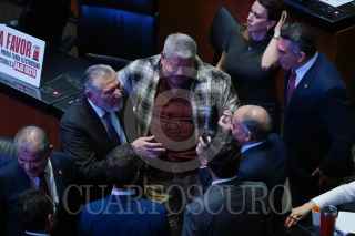 CIUDAD DE MÉXICO, 26FEBRERO2025.- Miguel Riquelme, senador priísta; Adán Augusto López, coordinador de Morena, Héctor Ladrón de Guevara; Alejandro Moreno Cárdenas, senador priísta; Manuel Añorve Baños, coordinador priísta, y Ricardo Anaya, coordinador panista, durante la sesión ordinaria en el Senado en la que se discutió las leyes secundarias en materia energética. FOTO: GALO CAÑAS/CUARTOSCURO.COM
