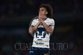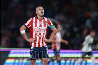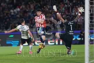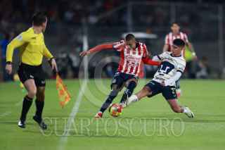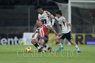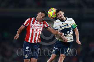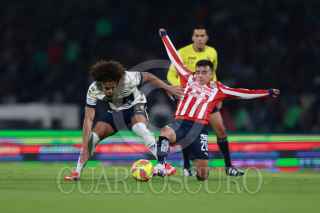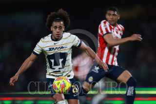 CIUDAD DE MÉXICO, 01MARZO2025. El delantero de Chivas, Javier Hernández defiende su posesión de balón ante los jugadores de Universidad, Ángel Azuaje y Santiago Trigos durante el partido de fútbol Pumas vs Guadalajara correspondiente a la jornada 10 del Torneo Clausura 2025 de Liga BBVA MX, en el Estadio Olímpico Universitario. FOTO: EDGAR NEGRETE LIRA/CUARTOSCURO.COM