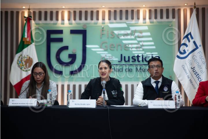 CIUDAD DE MÉXICO, 02MARZO2025.- Jorge Emilio Iruegas Álvarez, coordinador de investigación estratégica; Elizabeth Hernández Hernández, coordinador general de investigación territorial; Bertha Alcalde Luján, fiscal general de justicia; Alfonso Mendoza Ramírez, jefe general de la policía de investigación; Severiana Ortega López, coordinadora de investigación forense y Gemma Guadalupe Chávez Durán, coordinadora General de Investigación de Género durante la conferencia de prensa en la Fiscalía General de Justicia con en tema de Combate a la impunidad de Homicidio doloso. FOTO: ANDREA MURCIA /CUARTOSCURO.COM