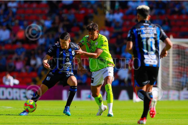 QUERÉTARO, QUERÉTARO, 02MARZO2025.- Ángel Zapata del Querétaro y Efraín Orona del Puebla durante el partido de la jornada 10 del Torneo Clausura 2025 de la Liga BBVA MX en el Estadio Corregidora. Los Gallos Blancos se impusieron 2-0. FOTO: CÉSAR GÓMEZ/CUARTOSCURO.COM