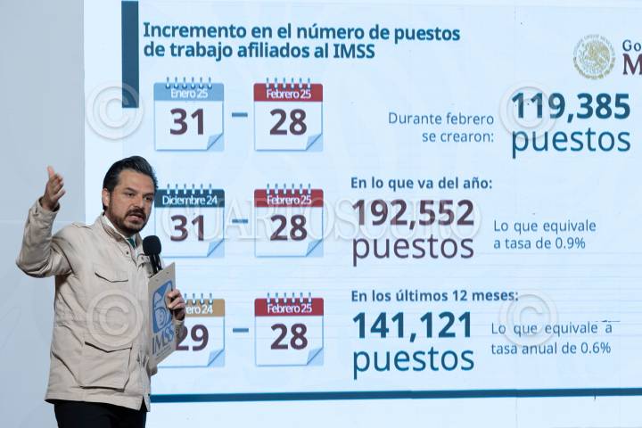 CIUDAD DE MÉXICO, 03MARZO2025.- Zoé Robledo, director del IMSS, muestra una gráfica con la creación del empleo y se destaca el dato que en febrero se registraron 119,385 nuevos empleos, durante la mañanera del pueblo. FOTO: MOISÉS PABLO/CUARTOSCURO.COM