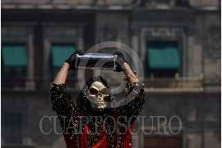 CIUDAD DE MÉXICO, 03MARZO2025.- Una estatura viviente de muerte pide dinero enfrente de Palacio Nacional. FOTO: GRACIELA LÓPEZ/CUARTOSCURO.COM