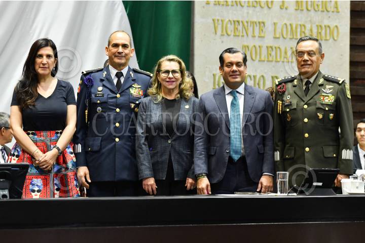 CIUDAD DE MÉXICO, 04MARZO2025.- Kenia López Rabadán, vicepresidenta de la mesa directiva; Óscar René Rubio Sánchez, General de División Piloto Aviador del Estado Mayor; María del Carmen Pinete, vicepresidenta de la mesa directiva; Sergio Gutiérrez Luna, presidente de la mesa directiva, y Norberto Cortés Rodríguez, General de División del Estado Mayor, durante la sesión solemne de la Cámara de Diputados en Conmemoración del 110 Aniversario de la Fuerza Aérea Mexicana y 112 Aniversario del Ejercito Mexicano. FOTO: MARIO JASSO/CUARTOSCURO.COM