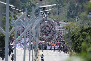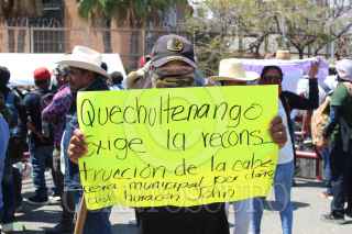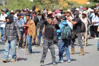 CHILPANCINGO, GUERRERO, 04MARZO2025.- Habitantes y transportistas de 13 municipios de la Montaña Baja, del Circuito Río Azul y la zona del Valle ingresaron a la capital del estado para reclamar el cumplimiento a demandas que se encuentran contenidas en un pliego petitorio, el cual fue presentado en agosto de 2023 y que aseguran, no se ha resuelto de manera satisfactoria. Para las 11:30 horas, los manifestantes llegaron a las inmediaciones del Parador del Marqués, donde de primera instancia instalaron un bloqueo en los cuatro carriles de la Autopista del Sol. Parte de los manifestantes cubren sus rostros con paliacates y con cachuchas, portan palos y en lonas en las que indican el lugar del que llegaron y cuales son las demandas que enarbolan. Entre los reclamos principales, demandan la rehabilitación de carreteras y la reconstrucción de puentes que el huracán John devastó en septiembre de 2024. La gobernadora Evelyn Salgado Pineda acudió a dialogar con los alcaldes de la Montaña baja y la región Centro de Guerrero. Antes del arribo de Salgado Pineda, un grupo de los inconformes se habría lanzado en contra de las puerta principal de Palacio de Gobierno, misma que lograron abrir por la fuerza y también lanzaron piedras utilizando resorteras para quebrar varios cristales. FOTO: DASSAEV TÉLLEZ ADAME/CUARTOSCURO.COM