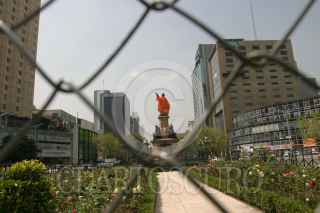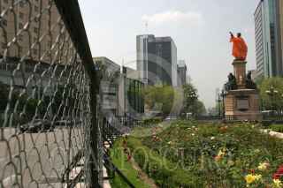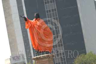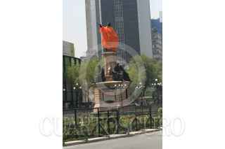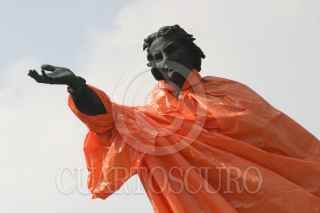 MEXICO,D.F.12OCTUBRE2007.- La estatua de Cristobal Colón ubicada sobre Paseo de la Reforma amaneció esta mañana cubierta con un impermeable naranja para protejerla de posibles agresiones durante la marcha que se realizara hoy por el Día de la Raza. FOTO:ROCIO ORTIZ/CUARTOSCURO.COM
