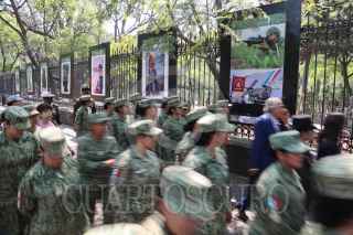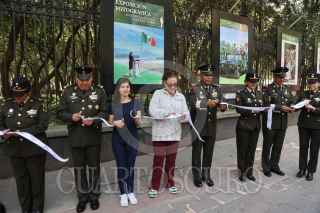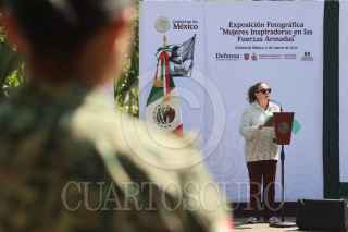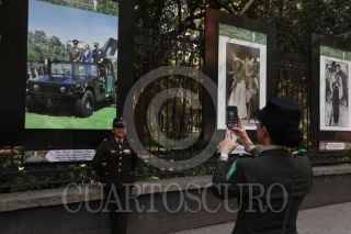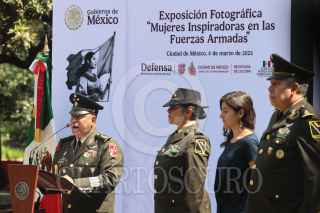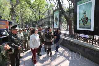 CIUDAD DE MÉXICO, 06MARZO2025.- La Secretaria de Cultura de la CDMX, Ana Francis López Bayghen Patiño Y EL general de Brigada, Andrés Valencia Valencia durante la inauguración de la exposición fotográfica "Mujeres Inspiradoras en las Fuerzas Armadas" que se encuentra sobre las rejas del bosque de Chapultepec, como parte de las actividades por la conmemoración del Día Internacional de la Mujer. FOTO: EDGAR NEGRETE LIRA/CUARTOSCURO.COM