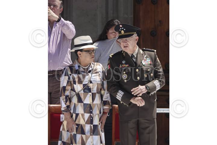 CIUDAD DE MÉXICO, 09MARZO2025.- Rosa Icela Rodríguez, Secretaria de Gobernación y Ricardo Trevilla Trejo, Secretario de la Defensa Nacional de México, durante la Asamblea Informativa en el Zócalo de la Ciudad de México. FOTO: MAGDALENA MONTIEL/CUARTOSCURO.COM
