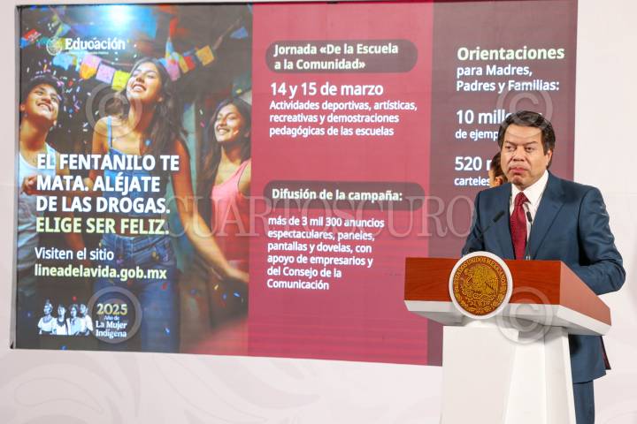 CIUDAD DE MÉXICO, 10MARZO2025.- Mario Delgado, títular de la SEP, habla sobre el lanzamiento de la campaña para evitar el consumo de fentalino entre los jóvenes, durante la conferencia del pueblo en Palacio Nacional. FOTO: MOISÉS PABLO/CUARTOSCURO.COM