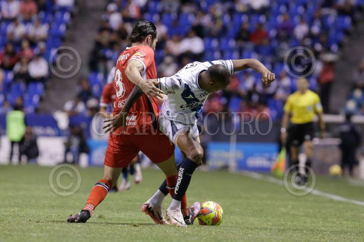 PUEBLA, PUEBLA, 14MARZO2025.- Antonio Briseño y Luis Quiñones durante el partido entre el Club Puebla y los Diablos Rojos de Toluca correspondiente a la jornada 12 del torneo Clausura 2025 de la Liga BBVA MX, celebrado en el Estadio Cuauhtémoc. FOTO: MIREYA NOVO/CUARTOSCURO.COM