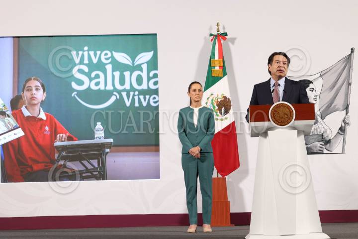 CIUDAD DE MÉXICO, 17MARZO2025.- Mario Delgado, titular de la SEP, informo que inicio la campaña Vida Saludable en escuelas primarias para fomentar hábitos saludables en alumnos. Además preciso que empresa de alimentos chatarras se han comprometido a no vender este tipo de alimentos en los centros educativos, durante la mañanera del pueblo. FOTO: MOISES PABLO/CUARTOSCURO.COM