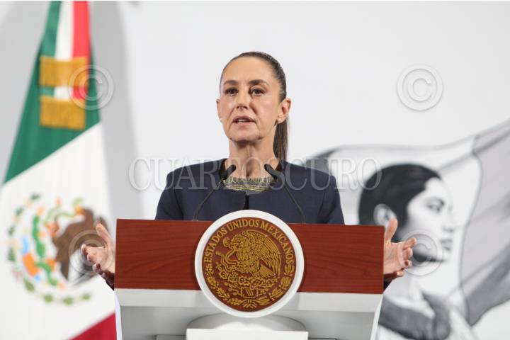 CIUDAD DE MÉXICO, 18 MARZO 2025.- Claudia Sheinbaum, presidenta de México, señala durante la mañanera que se detectó una alta participación de cuentas tipo bot en torno al caso de Teuchitlán. FOTO: CUARTOSCURO.COM