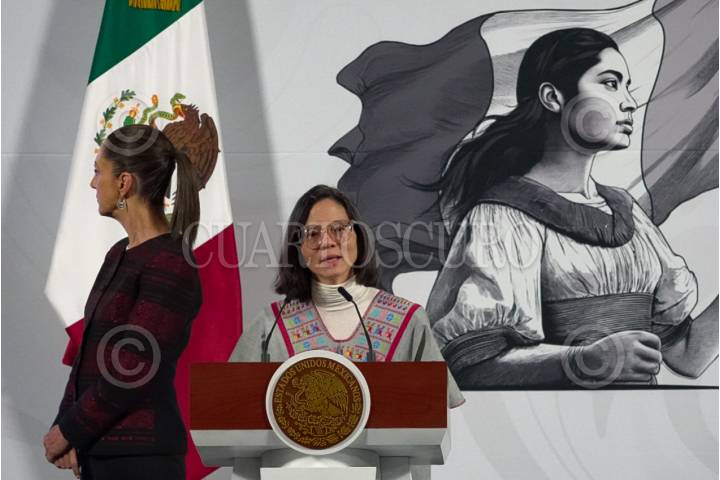 CIUDAD DE MÉXICO 21MARZO2025.- Yuki Hueda, directora de investigación, estadística e investigación aplicada del INPI durante la conferencia "La Mañanera del pueblo" realizada en el Salón Tesorería en Palacio Nacional. FOTO: ROGELIO MORALES CUARTOSCURO.COM