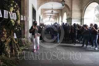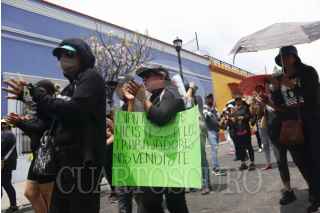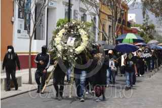 OAXACA DE JUÁREZ, OAXACA, 22MARZO2025.- Al menos un centenar de ex trabajadores del estado marcharon hacia el Palacio de Gobierno de Oaxaca para protestar en contra de la administración que encabeza el morenista Salomón Jara Cruz. Los manifestantes que gritaron consignas en contra de la autodenominada “Primavera Oaxaqueña”, portaron flores y una corona fúnebre marchitas. El gobierno estatal impulsó a finales del 2024 un decreto por el que se suprimían más de mil bases burocráticas supuestamente irregulares, sin embargo los empleados demostraron antigüedad y legalidad de sus nombramientos por lo que catalogaron la medida como arbitraria. FOTO: CAROLINA JIMÉNEZ MARISCAL/CUARTOSCURO.COM