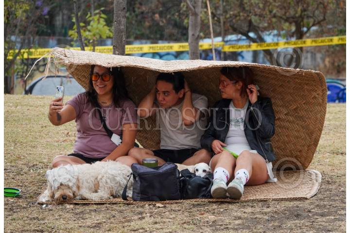 CIUDAD DE MÉXICO, 23MARZO2025.- Jóvenes se cubren de la lluvia durante el Festival "Primavera en Chapultepec 2025" en parque Parcur, primera sección de Chapultepec. FOTO: MAGDALENA MONTIEL/CUARTOSCURO.COM
