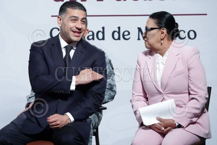 CIUDAD DE MÉXICO, 25MARZO2025.- Omar García Harfuch, secretario de Seguridad y Protección Ciudadana, y Rosa Icela Rodríguez, secretaria de Gobernación, durante la conferencia “Mañanera del Pueblo” en la que se presentó en informe semanales materia de seguridad. FOTO: GALO CAÑAS/CUARTOSCURO.COM