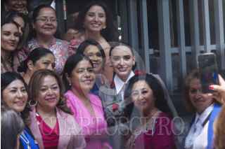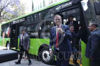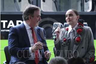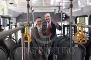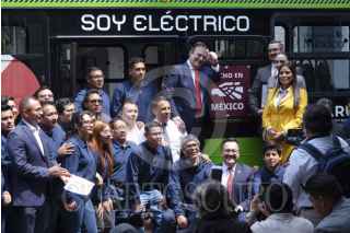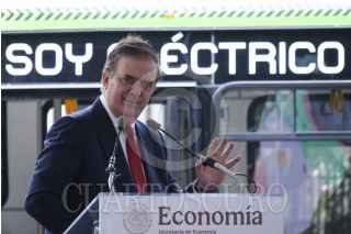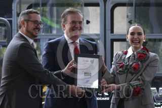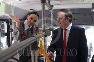 CIUDAD DE MÉXICO, 25MARZO2025.- Altagracia Gómez Sierra, la dirigente del Consejo Asesor de Desarrollo Económico Regional y Relocalización, y Marcelo Ebrard secretario de Economía, durante la presentación del primer autobús eléctrico mexicano desarrollado y fabricado en México, realizada en las instalaciones de esta institución. FOTO: GRACIELA LÓPEZ /CUARTOSCURO.COM