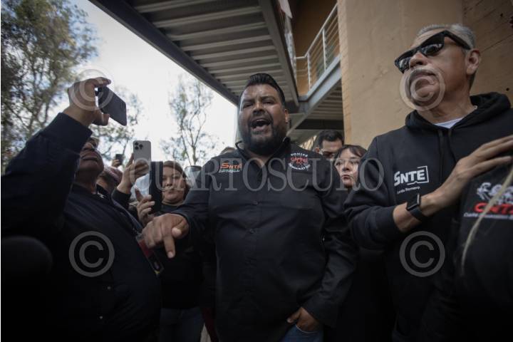TIJUANA BAJA CALIFORNIA 27MARZO2025.- Mas de cien docentes adheridos a la Coordinadora Nacional de Trabajadores de la Educación intentaron irrumpir la mañanera de la gobernadora de Baja California, Marina del Pilar que se estaba llevando a cabo en el Centro Estatal de Artes para exigir se cumplan las promesas de pago retrasados. Al llegar, los manifestantes a la entrada del lugar, los antimotines se hicieron presentes haciendo una valla para no dejar avanzar al contingente. El Secretario General de Gobierno, Alfredo Álvarez tras escucharse las consignas de los manifestantes, salió para atender a quienes alterados exigían sus pagos atrasados. De acuerdo con el Secretario General de la delegación 1-40 de la CNTE, faltan de pago 57 maestros, quienes no les brindan salario desde agosto del año pasado. El Secretario General de Gobierno, se comprometió a que el proximo viernes 28 de marzo se realizaría el primer pago a los docentes, adeudo que se calcula sea un total de 10 millones de pesos solo a los trabajadores de esta sección laboral FOTOS: CUARTOSCURO.COM