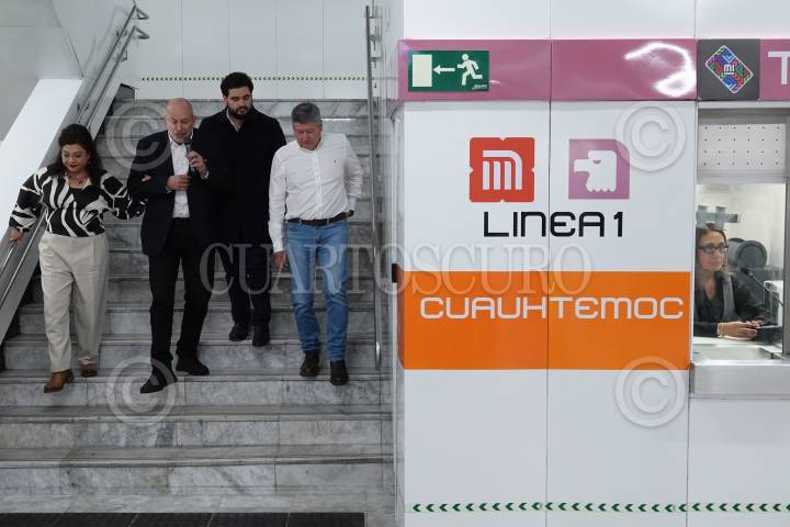 CIUDAD DE MÉXICO, 28MARZO2025.- Guillermo Calderón, director general del Sistema de Transporte Colectivo (STC)m Metro, la jefa de gobierno Clara Brugada, y Juan Pablo de Botton Falcón, secretario Secretario de Administración y Finanzas, realizaron un recorrido por las estaciones Cuauhtémoc, Insurgentes, Sevilla y Chapultepec para observar el fin de los trabajos de remodelación de la segunda etapa de la Línea 1. FOTO: GALO CAÑAS/CUARTOSCURO.COM