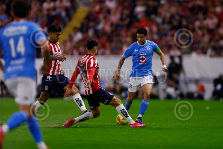 ZAPOPAN, JALISCO, 29MARZO2025.- José Rivero, mediocampista de Cruz Azul, frente a la marca de Miguel Gómez, defensa de las Chivas, en partido correspondiente a la jornada 13 del torneo clausura 2025 de la Liga MX. FOTO: FERNANDO CARRANZA/CUARTOSCURO.COM