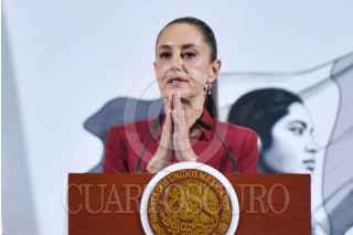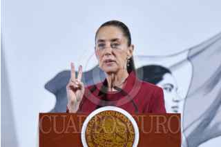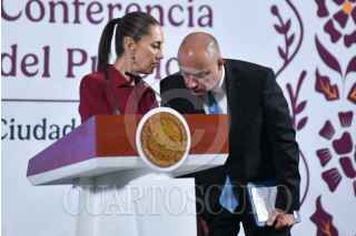 CIUDAD DE MÉXICO, 02ABRIL2025.- Claudia Sheinbaum, presidenta de México, y Jesús Antonio Esteva Medina, secretario de Infraestructura Comunicaciones y Transportes, durante la "Conferencia del pueblo" realizada en Palacio Nacional, en la que se informó sobre el incremento de empleos formales en el mes de marzo; los avances del plan ferroviario; estadísticas a tres años del inicio de operaciones del Aeropuerto Internacional Felipe Ángeles (AIFA), y su opinión ante la posible imposición de aranceles recíprocos que Donald Trump, presidente de Estados Unidos, anunciará hoy. FOTO: MARIO JASSO/CUARTOSCURO.COM