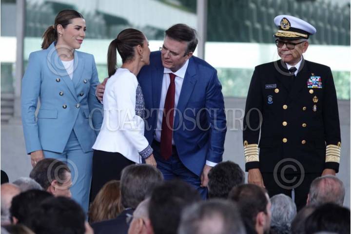 CIUDAD DE MÉXICO, 03ABRIL2025.- Claudia Sheinbaum, presidenta constitucional de los Estados Unidos Mexicanos, saludó a Marcelo Ebrard, secretario de Economía durante la presentación de la continuación del Plan México. Fortaleciendo la Economía y el Bienestar. El acto se realizó en el Museo de Antropología e Historia. FOTO: GRACIELA LÓPEZ/CUARTOSCURO.COM