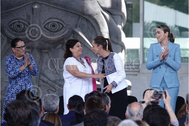 CIUDAD DE MÉXICO, 03ABRIL2025.- Clara Brugada, jefa de Gobierno, y Claudia Sheinbaum, presidenta constitucional de los Estados Unidos Mexicanos; se saludaron durante la presentación de la continuación del Plan México. Fortaleciendo la Economía y el Bienestar. El acto se realizó en el Museo de Antropología e Historia. FOTO: GRACIELA LÓPEZ/CUARTOSCURO.COM