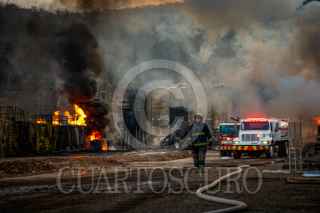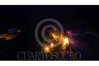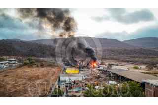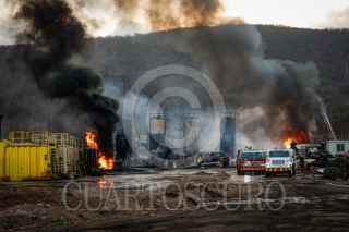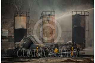 CULIACÁN, SINALOA, 03ABRIL2025.- Durante la madrugada de este jueves 3 de abril, un incendio de origen desconocido consumió una planta procesadora de diésel ubicada en una yarda al sur de Culiacán, provocando la movilización de distintas corporaciones de emergencia. El siniestro, reportado al 911 alrededor de las 2:00 a. m., fue atendido inicialmente por Bomberos Veteranos Culiacán, quienes, al percatarse de la magnitud del fuego, solicitaron apoyo. Al sitio llegaron Bomberos Culiacán, Protección Civil municipal y estatal, así como paramédicos de la Cruz Roja y voluntarios de Aguaruto. Debido a la presencia de material altamente inflamable, las llamas se propagaron rápidamente a otras áreas del establecimiento, obligando a las autoridades a desplegar varias pipas con miles de litros de agua para sofocar el fuego. FOTO: JOSÉ BETANZOS ZÁRATE/CUARTOSCURO.COM