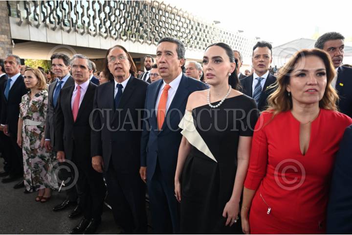 CIUDAD DE MÉXICO, 03ABRIL2025.- Los empresarios Carlos Slim Domit, Guadalupe Phillips Margain, Alfonso de Angoitia, Bernardo Gómez Martínez, y Altagracia Gómez, durante el lanzamiento del Plan México presentado por la Presidenta de México, para hacer frente al alza de aranceles del gobierno estadounidense. La cita fue en el Museo de Antropología. FOTO: PRESIDENCIA/CUARTOSCURO.COM