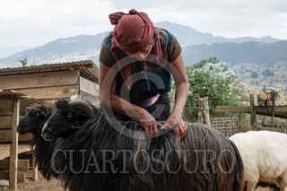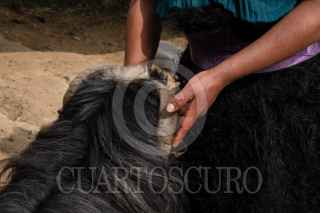SAN JUAN CHAMULA, CHIAPAS, 04MARZO2025.- Una de las actividades económicas internas más importantes de este municipio, por el resguardo de la tradición y la cultura tsotsil chamula; es la fabricación de la ropa tradicional elaborada con lana de ovejas criadas por las mismas familias que elaboran estas prendas, las cuales dependiendo la calidad de la lana y el largo oscilan entre los cinco mil y treinta mil pesos mexicanos. Gustavo aprendió de su madre Veronica el oficio, la acompaña a cuidar sus ovejas y le apoya en todo el proceso de fabricación. FOTO: ISABEL MATEOS HINOJOSA /CUARTOSCURO.COM