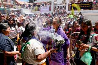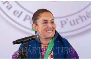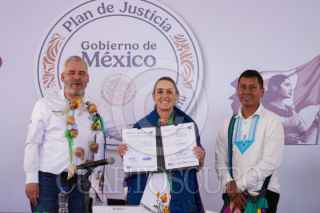 PARACHO, MICHOACÁN, 05ABRIL2025.- Claudia Sheinabum, presidenta de México, encabezó el acto protocolario "Plan de justicia para el pueblo purépecha". La acompañan: Alfredo Ramírez Bedolla, gobernador de Michoacán, y Felipe Márquez Escamilla, presidente del comisariado de bienes comunales de Cherán Atzicuirín. FOTO: PRESIDENCIA/CUARTOSURO.COM