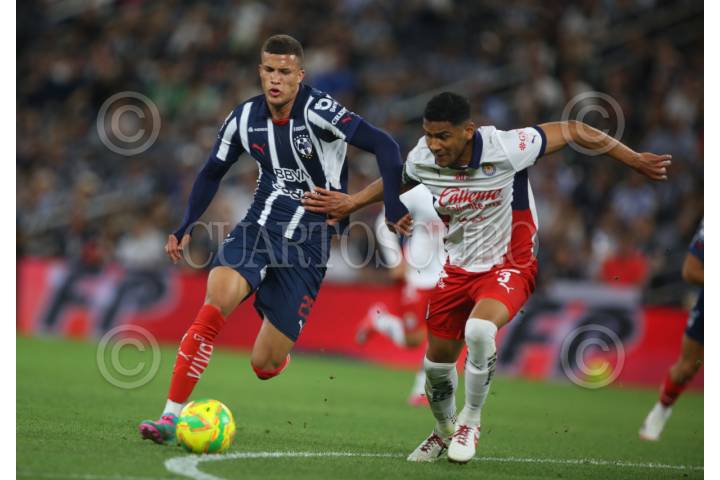 GUADALUPE, NUEVO LEÓN, 05ABRIL2025.- Roberto de la Rosa de los Rayados del Monterrey, se disputa el balón con Gilberto Sepúlveda de las Chivas del Guadalajara, en el estadio BBVA, partido correspondiente a la jornada 14 de la Clausura 2025 de la Liga Mx. Marcador Final: Monterrey: 3 - Guadalajara: 1 FOTO: GABRIELA PÉREZ MONTIEL / CUARTOSCURO.COM