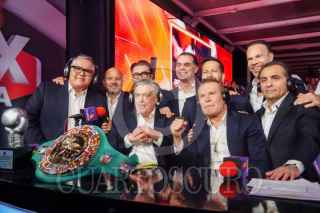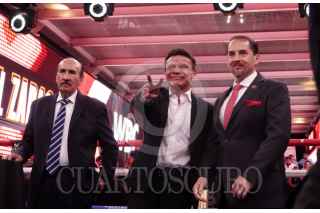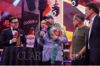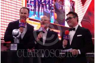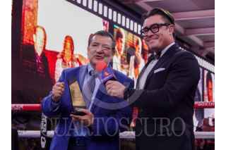 CIUDAD DE MÉXICO, 05ABRIL2025.- Los exboxeadores Carlos Zárate y Daniel Zaragoza durante el homenaje a Eduardo Lamazón por sus 50 años de trayectoria en los medios y en el boxeo, lo anterior, durante la función de Box Azteca. FOTO: MAGDALENA MONTIEL/CUARTOSCURO.COM