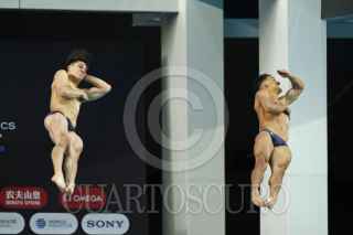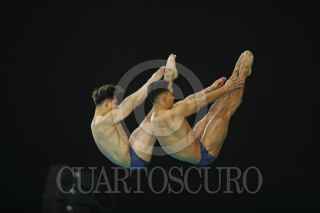 ZAPOPAN, JALISCO. 06ABRIL2025.- Hoy en el Centro Acuático Metropolitano y durante la justa deportiva del Mundial de Clavados Guadalajara 2025, se llevo a cabo la final en Trampolín de 3 metros sincronizado varonil, en donde los mexicanos Osmar Olvera y Juan Manuel Celaya termino en 1er lugar, consiguiendo así la medalla de Oro para su país. FOTO: FERNANDO CARRANZA GARCIA / CUARTOSCURO.COM