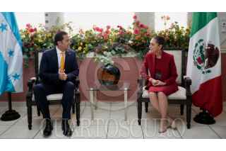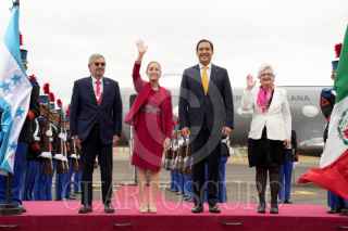 TEGUCIGALPA, HONDURAS, 09ABRIL2025.- Claudia Sheinbaum, Presidenta de México, arribo a Tegucigalpa, para asistir a la IX Cumbre de la Comunidad de Estados Latinoamericanos y Caribeños (Celac); fue recibida por el secretario privado de la presidenta Xiomara Castro Sarmiento, Héctor Manuel Zelaya Castro. Acompañan a la primera mandataria mexicana: el secretario de Relaciones Exteriores, Juan Ramón de la Fuente Ramírez; y la subsecretaria para América Latina y el Caribe, Raquel Serur Smeke. FOTO: PRESIDENCIA/CUARTOSCURO.COM
