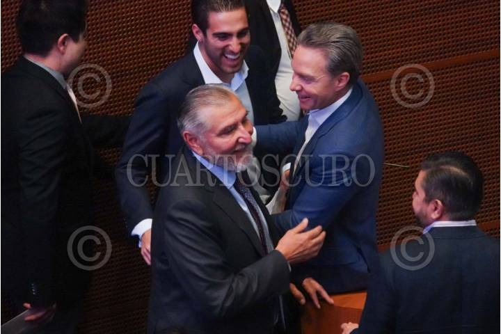CIUDAD DE MÉXICO, 08ABRIL2025.- Los senadores Adán Augusto y Manuel Velasco se saludaron durante la Sesión Ordinaria en el Senado de la República. FOTO: GRACIELA LÓPEZ/CUARTOSCURO.COM