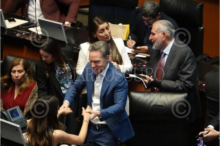 CIUDAD DE MÉXICO, 08ABRIL2025.- Los senadores Andrea Chávez y Manuel Velasco se saludaron durante la Sesión Ordinaria en el Senado de la República. FOTO: GRACIELA LÓPEZ/CUARTOSCURO.COM