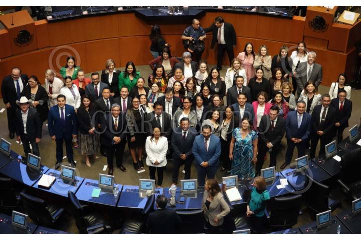 CIUDAD DE MÉXICO, 08ABRIL2025.- Rl senador Gerardo Fernández Noroña, presidente de la mesa directiva, acompañado de los próximos magistrados electorales locales de 30 Estados de la República que tendrán un periodo de 9 años, se tomaron una fotografía en el pleno del Senado de la República. FOTO: GRACIELA LÓPEZ/CUARTOSCURO.COM