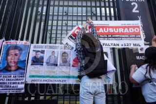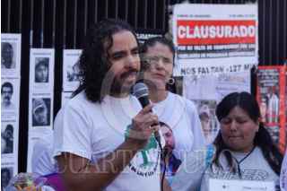 CIUDAD DE MÉXICO, 10ABRIL2025.- Jorge Verástegui, defensor de derechos humanos y buscador, tomó la palabra durante la clausura simbólica de la Cámara de Senadores para protestar tras las recientes acciones que la Cámara Alta ha tomado respecto al Comité en Contra de la Desaparición Forzada de la ONU tras la aplicación del artículo 34 del mismo para declarar que la desaparición forzada en México es una cuestión sistemática. Las y los integrantes colocaron las fichas con los rostros de cientos de desaperecidos en el país a las afueras de la Puerta 2 del recinto, así cómo dos carteles de clausurado. FOTO: GALO CAÑAS/CUARTOSCURO.COM