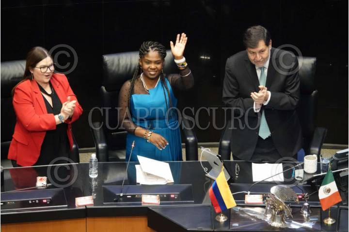 CIUDAD DE MÉXICO, 10ABRIL2025.- Francia Elena Márquez Mina, vicepresidenta de la República de Colombia, durante su llegada a la Sesión Solemne en el Senado de la República. La acompañan los senadores Imelda Castro Castro y Gerardo Fernández Noroña, vicepresidenta y presidente de la mesa directiva de la Cámara de Senadores. FOTO: GRACIELA LÓPEZ/CUARTOSCURO.COM
