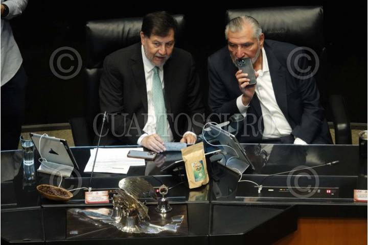 CIUDAD DE MÉXICO, 10ABRIL2025.- Los senadores Gerardo Fernández Noroña, presidente d ella mesa directiva, y Adán Augusto, coordinador de la JUCOPO, conversaron durante la Sesión Ordinaria en el Senado de la República. FOTO: GRACIELA LÓPEZ/CUARTOSCURO.COM
