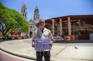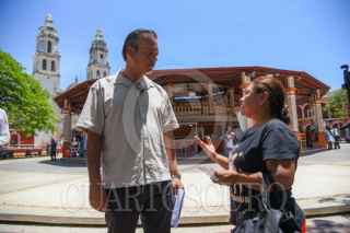 CAMPECHE, CAMPECHE, 10ABRIL2024.- El candidato a Ministro de la Suprema Corte de Justicia de la Nación, César Mario Gutiérrez Priego, durante su visita a la capital campechana, recorrió el parque principal del centro histórico, compartiendo sus propuestas y compromisos contra la corrupción. Al referirse a su padre, expresó: "Fui torturado, fui secuestrado porque estaba en contra de él, y si ser hijo de mi padre me cuesta no ser ministro, lo pago con mucho gusto". FOTO: MICHAEL BALAM/CUARTOSCURO.COM