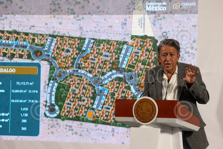 CIUDAD DE MÉXICO, 14ABRIL2025.- Rodrigo Chávez Contreras, director del Conavi, durante la mañanera del pueblo, en la cual anuncio que se amplio en cien mil viviendas la meta de un millón que se tenía programada por parte del Programa Nacional de Vivienda. FOTO: MOISÉS PABLO/CUARTOSCURO.COM
